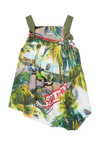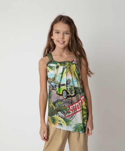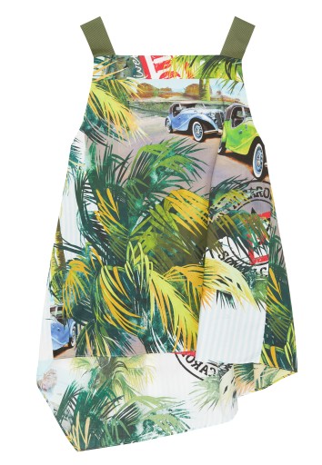 Stylowy top wykonany z ozdobnej popeliny to doskonały dodatek do każdego dołu z kolekcji Kraft. Ciekawy wzór tkaniny, stanowiący kompozycję fabularną, idealnie „pasuje” do modnego kształtu blatu z asymetryczną linią półki. Top posiada paski wykonane z nadrukowanych chust (plecionek), które wkręca się w oczka w celu mocowania i można je dopasować do każdego wzrostu dziecka. Skład: 100% bawełna