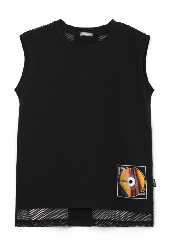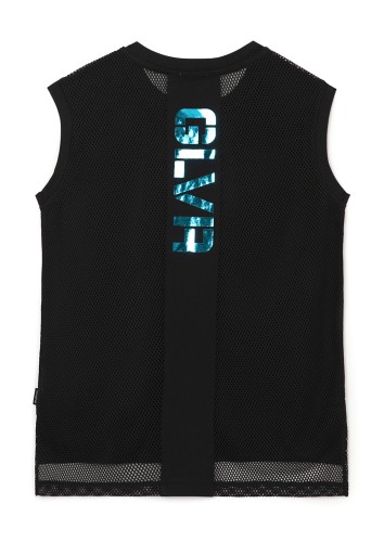 Obszerny, luźny czarny T-shirt z niską linią pleców docenią miłośnicy niestandardowych rozwiązań. Modny design modelu, oparty na połączeniu faktur dzianiny i siateczki, a także wyraźna geometria rozwiązania konstrukcyjnego i jasne, opalizujące akcenty stworzone przy użyciu kolorowej folii, tworzy jasny, odważny wizerunek w sportowym stylu. Z dowolnymi spodenkami T-shirt stworzy stylowy komplet na upalne dni lub stanie się zauważalnym elementem modnej warstwowej stylizacji. Skład: materiał główny: 100% bawełna; materiał wykończenia: 100% poliester