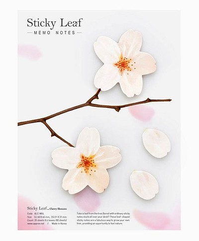Karteczki samoprzylepne indeksujące w kształcie kwiatów wiśni. Każdy listek papieru jest samoprzylepny — dzięki temu znajdzie zastosowanie jako klasyczna kartka do notatek oraz jako zakładka indeksująca. Wykorzystasz je w domu, biurze, w planerach, książkach. W fantastyczny i kreatywny sposób można je również wykorzystać do scrappbookingu oraz bullet journalingu. Arkusz zawiera 4 x 20 szt. kartek. Wymiary karteczek: 60x60 mm i 21x31mm. Appree to koreańska marka produkująca akcesoria papiernicze inspirowane naturą. Każdy produkt jest najwyższej jakości, estetyczny, wykonany z dbałością o detale.