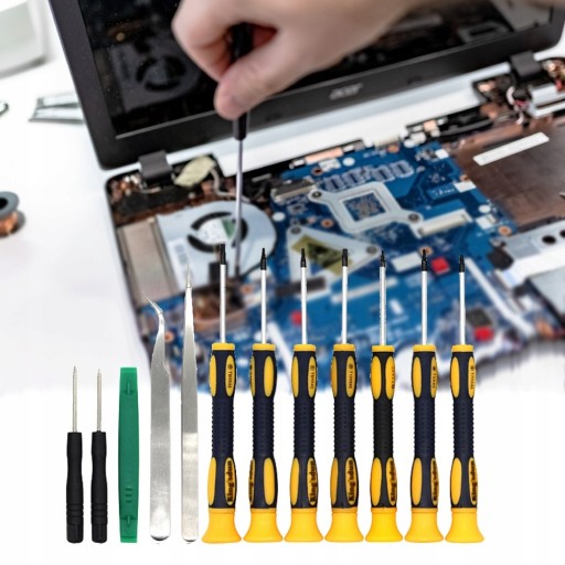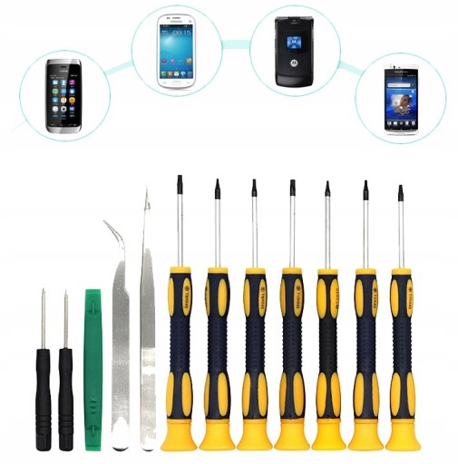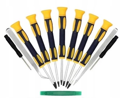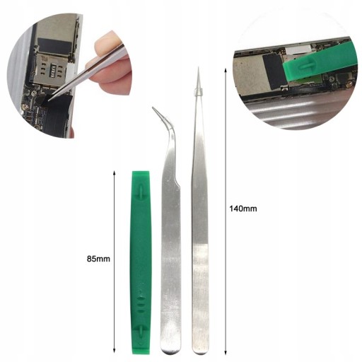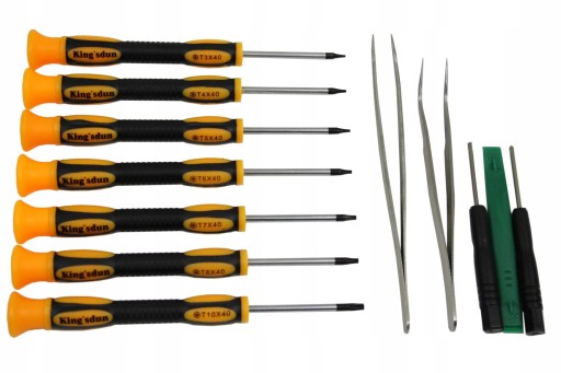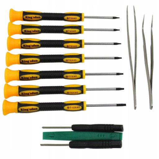 - W zestawie: Pęseta prosta, pęseta precyzyjna, 9 śrubokrętów, otwierak