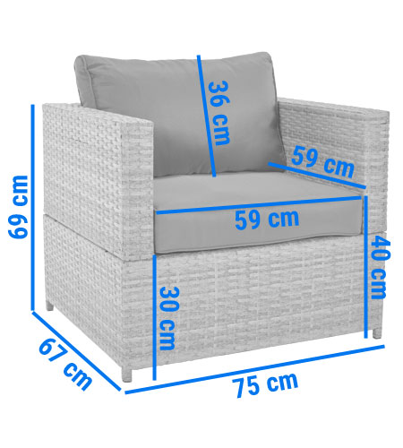 - Wymiary poduszek: fotel: 59 x 59 x 10 cm, 59 x 36 x 14 cm, sofa: 65 x 67 x 10 cm, 65 x 36 x 14 cm