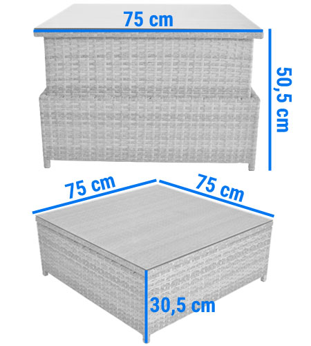 - Wymiary stołu: 75 x 75 x 30,5 / 50,5 cm