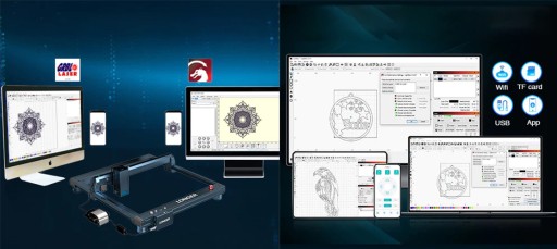 kompatybilne z LaserGRBL, LightBurn i obsługa Windows 7+, macOS i Linux.Obsługiwane formaty plików: JPG, PNG, BMP, G-kod, GIF, SVG, NC, GC itp.