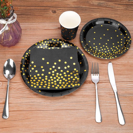 Ich wygląd sprawia, że świetnie komponują się z różnorodnymi aranżacjami stołów, będąc uniwersalnym dodatkiem do imprez, urodzin, przyjęć czy nawet uroczystości ślubnych. Złote kropki nadają im elegancji, podkreślając wyjątkowy charakter każdego stołu.