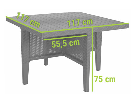 Duży kwadratowy stół o wymiarach: 117 x 117 x 75 cm swobodnie pomieści 4 osoby. Konstrukcja stołu jest dodatkowo wzmocniona metalowymi elementami.