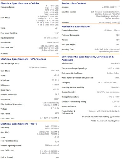 Antena jest również wyposażona w dwie dwuzakresowe anteny Wi-Fi, zapewniające równoczesne pasmo 2,4 GHz i 5 do 7,2 GHz na każdej antenie dla funkcji 2x2 MIMO. MIMO-4-17 przewyższa wydajność większości konkurentów ze względu na dbałość o konstrukcję tej wysokowydajnej anteny. Wzorce promieniowania wszystkich elementów promieniujących zapewniają doskonałą równowagę między wielokierunkowością, różnorodnością wzorców i dobrymi zdolnościami promieniowania na żądanej wysokości. Jest to ważne kryterium dla rynku transportowego i morskiego, dla którego antena została specjalnie zaprojektowana. Główne zastosowania to pojazdy komercyjne/przemysłowe, systemy morskie, M2M i inne systemy IoT wykorzystujące szeroką gamę technologii radiowych, przy jednoczesnym zachowaniu przyszłości w szerokim paśmie częstotliwości.