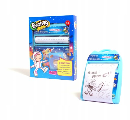 Nasza tablica posiada w zestawie specjalny arkusz z rysunkami tematycznie związanymi z kosmosem - wystarczy, że dziecko rozwinie rolkę papieru i będzie mogło cieszyć się nieograniczoną zabawą podczas kolorowania.
