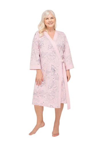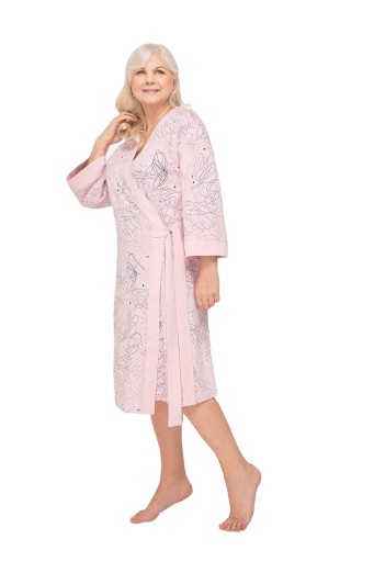 Dekolt w kształcie litery V, zwieńczony plisą. Szlafrok wiązany w pasie, na długi rękaw wykończony mankietem. Produkt idealny dla Pań ceniących elegancki styl, praktyczność, komfort i jakość. Produkt wykonany starannie, z bawełny wysokiej jakości odpowiadającej standardowi Oeko – Tex Standard.