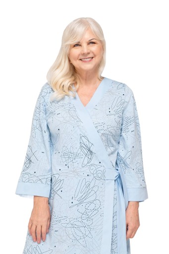 Dekolt w kształcie litery V, zwieńczony plisą. Szlafrok wiązany w pasie, na długi rękaw wykończony mankietem. Produkt idealny dla Pań ceniących elegancki styl, praktyczność, komfort i jakość. Produkt wykonany starannie, z bawełny wysokiej jakości odpowiadającej standardowi Oeko – Tex Standard.