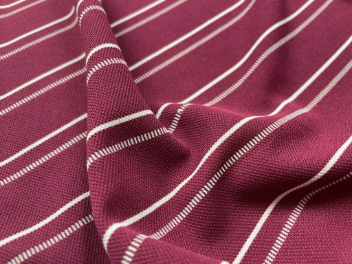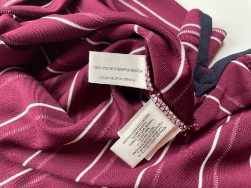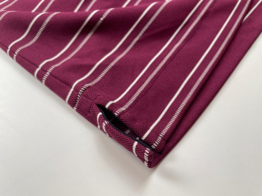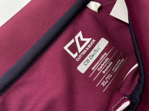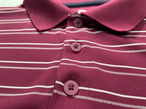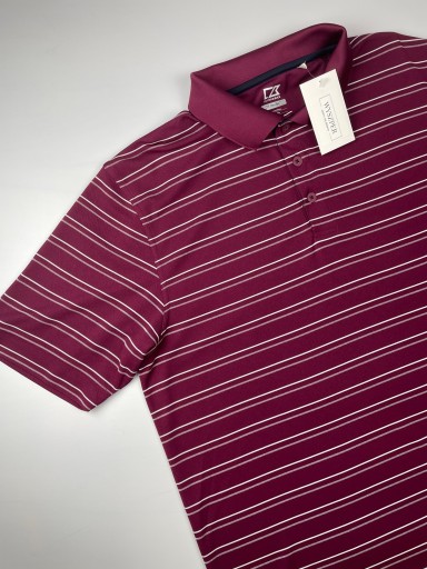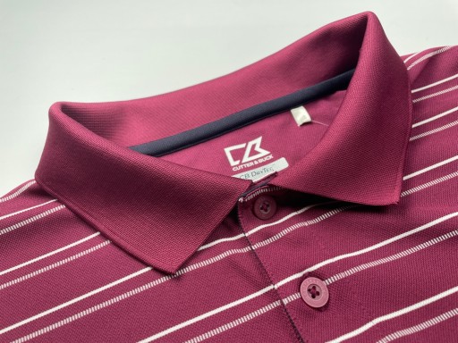 - Sportowa koszulka polo marki Cutter&Buck. Jest w bordowym kolorze we wzór białych, poziomych pasków. Koszulka jest z krótkim rękawkiem, ma kołnierzyk zapinany na logowane marką guziki. Jest o klasycznym, prostym kroju. Po bokach posiada rozporki. Bluzka wykonana z materiału o delikatnie kropkowanej strukturze. Posiada zapasowy guzik.