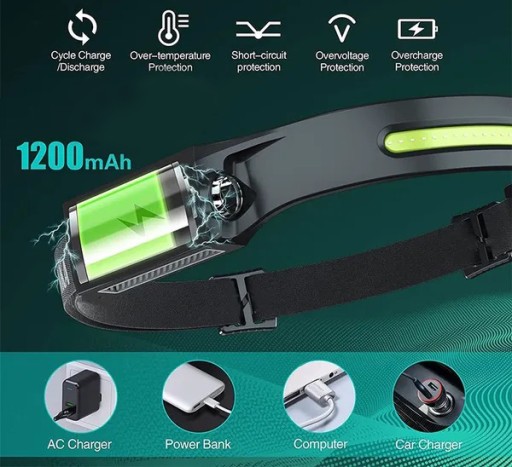 Latarka czołowa COB LED bardzo mocna na głowę z czujnikiem ruchu