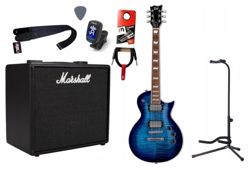 Zestaw gitarowy, elementy zestawu: 1x Gitara elektryczna (opis poniżej), 1x Combo gitarowe 50W (Marshall CODE 50), 1x Kabel gitarowy 3m (Red's Music GC1130BX), 1x Statyw do Gitary (Hamilton Stands KB-303), 1x Tuner gitarowy (Jeremi A9), 1x Pasek do gitary (Rali Nylon70), 1x Kostka gitarowa (Janicek).