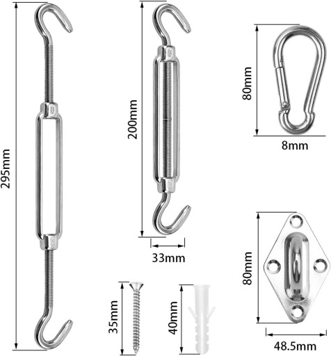 - Z karabińczykami, nakrętkami napinającymi i uchwytami ten zestaw narzędzi umożliwia łatwą i bezpieczną instalację żagla przeciwsłonecznego.