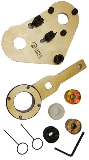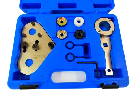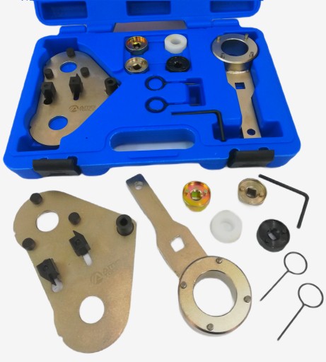 Profesjonalny zestaw marki AMD TOOLS do demontażu zaworów wałka rozrządu, koła pasowego wału korbowego, wymiany łańcucha rozrządu oraz do blokowania i ustawienia rozrządu w odpowiedniej pozycji.