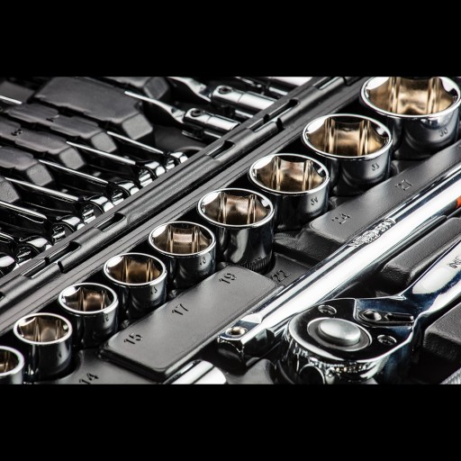 Ilość elementów pozwala na tysiące kombinacji. Wszystkie nasadki, grzechotki i klucze wykonane są z wysokowytrzymałej stali chromowo-wanadowej (Cr-V). Wszystkie końcówki wkrętakowe wykonane ze stali narzędziowej S2. Całość w odpowiednio dopasowanej, mocnej walizce z metalowymi zatrzaskami.