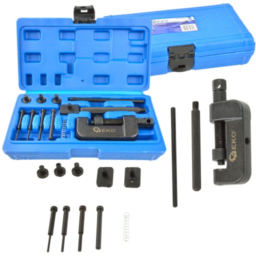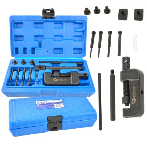 Zakuwarka-nitownica do łańcuchów motocyklowych. Przeznaczona do zakuwania i rozkuwania łańcuchów rozrządu oraz łańcuchów napędowych. Zestaw przydatny w warsztatach motocyklowych, rowerowych i samochodowych.