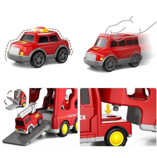 - 🚒Zaprojektowany dla małych entuzjastów strażaków, zawiera większy pojazd transportowy i 6 małych samochodów (samochód strażacki, ciężarówka z drabiną, helikopter, ciężarówka zraszająca, samochód i SUV).