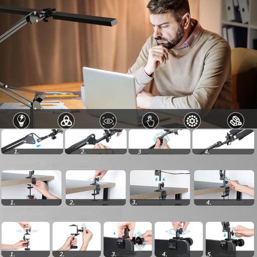 Ta lampa biurkowa LED ma podwójną głowicę, którą można obracać o 360 stopni, co pozwala regulować kąt listwy świetlnej. Dzięki 26-calowej listwie świetlnej LED o mocy 24 W i mocy 1000 lm zapewnia wystarczającą jasność i skutecznie oszczędza energię, może rozszerzyć się do 30 cali, co w pełni oświetla stół. Nadaje się do stacji roboczej z wieloma monitorami, architekta, rysowania, szycia, rzemiosła, czytania, gier.