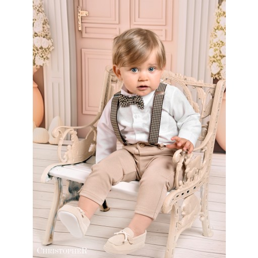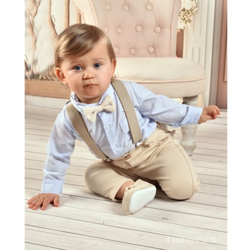 W zestawie ma spodenki z tkaniny rozciągliwej, co ułatwia ubieranie dziecku, Koszulo-Body to tkanina koszulowa z bawełny zapinane w kroku. Szelki z gumy najwyższej jakości.