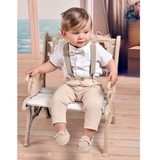 W zestawie ma spodenki z tkaniny rozciągliwej, co ułatwia ubieranie dziecku, Koszulo-Body to tkanina koszulowa z bawełny zapinane w kroku. Szelki z gumy najwyższej jakości.