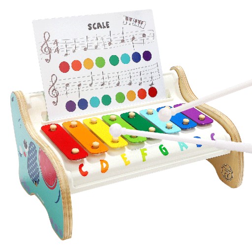 Drewniane cymbałki w kształcie słonia to 8-tonowy instrument stworzony specjalnie dla dzieci. Dzięki tym cymbałkom nauka gry jest prostsza, ponieważ na instrumencie umieszczono specjalne nutki z zapisem nutowym. Dodatkowo, pod nutkami znajdują się kolorowe kropki, które wskazują na kolor odpowiadającego dzwonka, co ułatwia naukę.