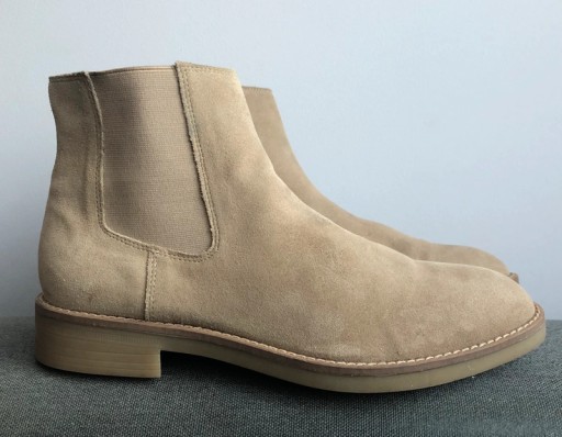 Wykończenie z dwoiny. Elastyczne wstawki w tym samym odcieniu po bokach cholewki ułatwiające zakładanie. Zaokrąglony nosek. Kontrastowa podeszwa z gumy.