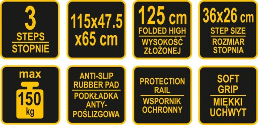 Drabina po rozłożeniu ma wymiary 115x47,5x65cm, a po złożeniu wysokość zaledwie 125cm. Dzięki czemu nie zajmuje dużo miejsca podczas przechowywania czy transportu i przenoszeniu.