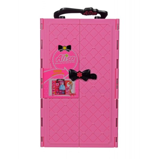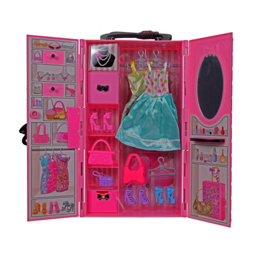 Wspaniała szafa na ubranka dla lalek wyposażona w dwuskrzydłowe drzwi.Zamek w kształcie kokardy zabezpiecza szafę przed otwieraniem.Garderoba ma wygodną rączkę z góry, dzięki której można bezpieczniei łatwo ją przenosić. Szafa jest wyposażona w owalne lustro z półkąoraz regał z półkami na buty, torebki, pojemniki na biżuterię i wieszaki.Dzięki temu każde akcesoria będą miały swoje miejsce i nic się nie zgubipodczas zabawy. Szafę łatwo można złożyć i rozłożyć do zabawy - wystarczytylko podnieść haczyk i otworzyć drzwiczki.