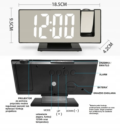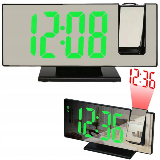Stylowy zegar o uniwersalnych kolorach z wyraźnym ekranem to przedmiot, który powinien znaleźć się w każdym domu. Wyświetlanie aktualnej godziny na ekranie z zielonym podświetleniem, a także możliwość ustawienia alarmu to funkcje potrzebne każdemu! Dodatkowo zegar posiada opcję wyświetlania aktualnego czasu na ścianie lub suficie, co jest bardzo wygodne np. w sypialni.