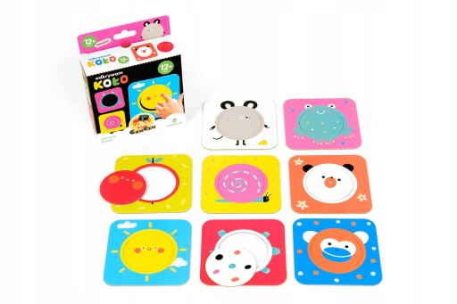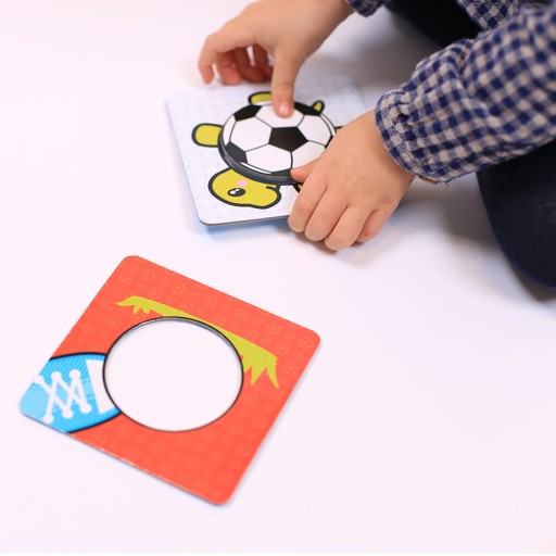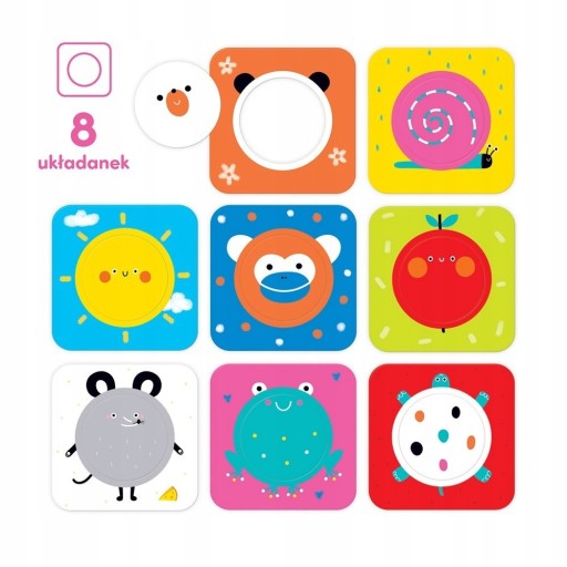 Składa się 8 dużych dwuelementowych układanek. Zabawa polega na dopasowywaniu wyjmowanych kółeczek. Możecie je dowolnie wymieniać pomiędzy tabliczkami, co sprawia dodatkową radość. Pokaż maluchowi, że kółeczko pasuje do dziurki i opowiadaj, co jest na ilustracji. Wszystkie kółeczka są wymienne, dlatego możliwe są także nieoczywiste połączenia. Każde dopasowanie jest sukcesem i powodem do radości.