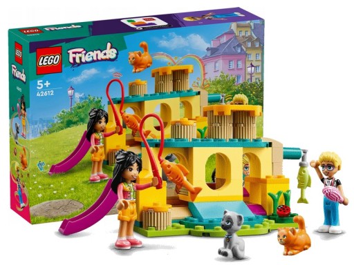 Pięcioletni i starsi miłośnicy kotów będą zachwyceni zestawem LEGO® Friends Przygoda na kocim placu zabaw (42612). Zawiera on plac zabaw do zbudowania, dwie minilaleczki, dwa zwierzątka i akcesoria do pielęgnacji zwierząt, w tym zabawkową rybkę, zabawkową kocimiętkę, jedzenie i kuwetę.