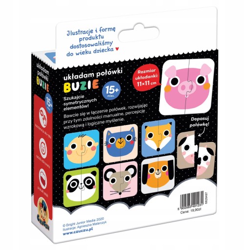 Czas rozpocząć puzzlową przygodę! Dopasujcie do siebie 2 połówki i sprawdźcie, czyja to buzia. Elementy są duże i pasują do małych rączek, a dzięki precyzyjnemu wykonaniu ułożone puzzle nie rozłączają się. Przyjazne ilustracje o stonowanej kolorystyce i poziomie szczegółowości zachęcają maluchy do zabawy.