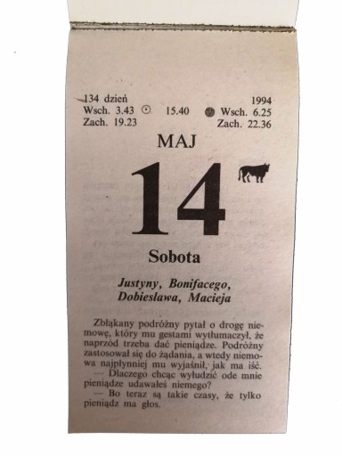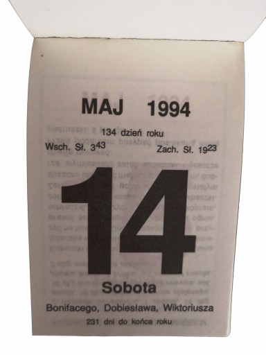 Tu kupisz kartkę wyjętą z oryginalnego kalendarza zdzieraka z 1994 roku. Dzień i miesiąc oczywiście wybierzesz sam(a). Nie zapomnij podać daty w "uwagach do zakupu". Przykładowa kartka na zdjęciu obok.
