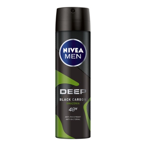 NIVEA MEN Deep Amazonia z czarnym węglem w sprayu zapewnia długotrwałe uczucie suchej i czystej skóry. Formuła z aktywnym węglem zapewnia silna ochronę antybakteryjną. Skuteczna 48-godzinna ochrona antyperspirantu dla Twojej skóry. Długotrwały, męski i świeży zapach AMAZONIA . Łagodność dla skóry potwierdzona dermatologicznie