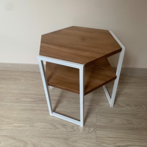 Stolik kawowy jest wykonany z profila stalowego 20mm x 20mm, oraz blatu dębowego o gróbości 20 mm. Blat jest zabezpieczony lakierem który chroni drewno przed wilgocią i przebarwieniami. Sześciokątny krztałt stolika nadaje mu nowoczesny charakter dzieki czemu stolik pasuje zarówno do salonu jak i gabinetu.