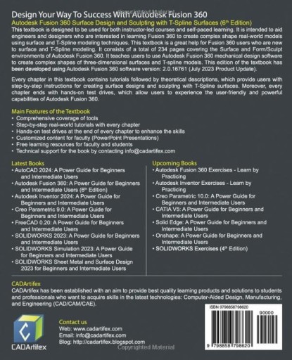 Autodesk Fusion 360 Surface Design and Sculpting with T-Spline Surfaces (6th Edition) textbook is designed to be used for both instructor-led courses and self-paced learning. It is intended to aid engineers and designers who are interested in learning Autodesk Fusion 360 to create complex shape real-world models using surface and T-Spline modeling techniques. This textbook is a great help for Autodesk Fusion 360 users who are new to surface and T-Spline modeling. It consists of a total of 234 pages covering the Surface and Form/Sculpt environments of Autodesk Fusion 360. It teaches users to use Autodesk Fusion 360 mechanical design software to create complex shapes of three-dimensional surfaces and T-spline models. This edition of the textbook has been developed using Autodesk Fusion 360 software version: 2.0.16761 (July 2023 Product Update).This textbook not only focuses on the usage of the tools and commands of Autodesk Fusion 360 for creating surface and T-Spline models but also on the concept of design. Every chapter in this textbook contains tutorials followed by theoretical descriptions, which provide users with step-by-step instructions for creating surface designs and sculpting with T-Spline surfaces. Moreover, every chapter ends with hands-on test drives, which allow users to experience the user-friendly and powerful capabilities of Autodesk Fusion 360.
