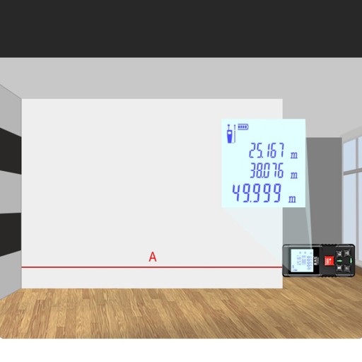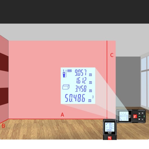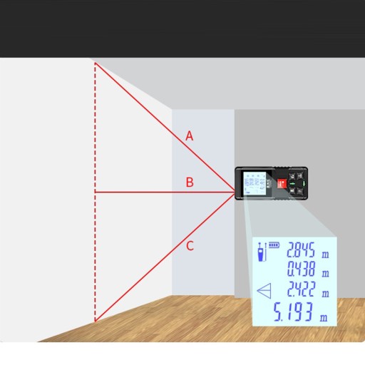 Krótko naciśnij klawisz FUNC cztery razy, aby przejść do pośredniego trybu pomiaru pitagorejskiego, następnie naciśnij klawisz MEAS, aby zmierzyć długość A/B/C na obrazie i automatycznie obliczyć wysokość pionową pomiędzy A/B/C.