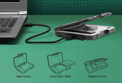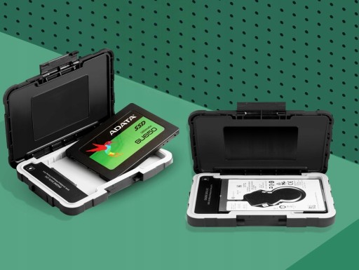 Zewnętrzna obudowa ED600 to wytrzymała i trwała obudowa z wewnętrzną okładziną z gumy silikonowej zapewniającą odporność na uderzenia i klasą IP54 odporności na wodę i kurz. Stosowana jest w różnych modelach dysków HDD lub SSD o rozmiarze 2,5. Obudowa ED600 jest zgodna z laptopami, komputerami PC, PS4, XBOX One oraz innymi konsolami gier wideo. Beznarzędziowa instalacja i przełączanie jednym przyciskiem zapewniają łatwy dostęp nawet dla początkujących użytkowników komputerów. Obudowa ED600 to niezbędne zabezpieczenie zewnętrznego dysku HDD/SSD do ochrony danych!