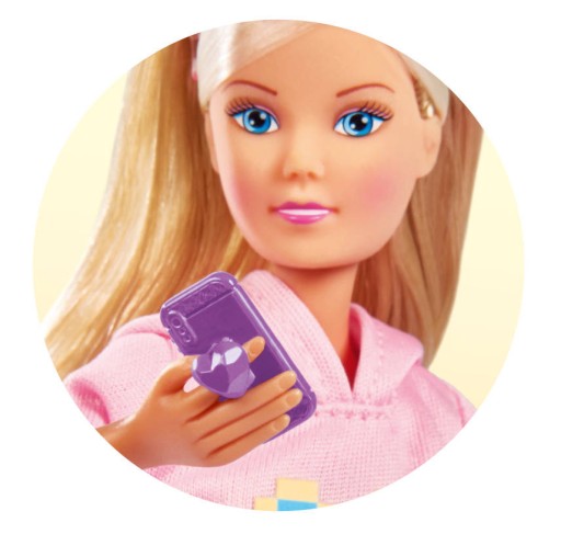 - - Steffi ma telefon z uchwytem na palec, który jest przewieszony przez ramię na modnym mocowaniu- stylizację Steffi dopełnia shoppingowa torba