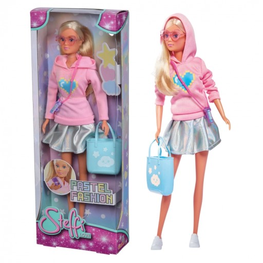 - - lalka Steffi w zgodzie z najgorętszymi, wiosennymi trendami jest ubrana w pastelową bluzę z kapturem z modnym pikselowym nadrukiem