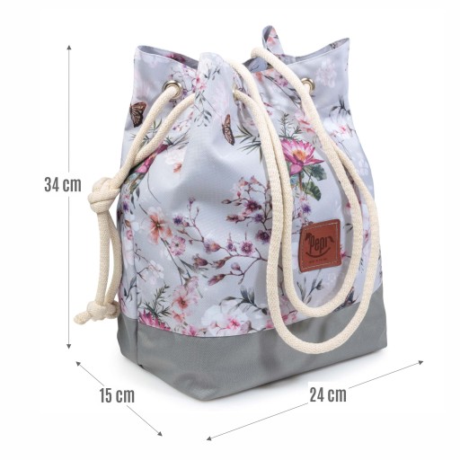 Lekka torba miejska pomieści dokumenty A4. Torebka wykonana jest z mocnej, wysokiej jakości tkaniny. Materiał jest wodoodporny i nie mechaci się. Wnętrze uszyte jest również z wodoodpornej podszewki. Worek w środku posiada dodatkową kieszonkę zapinaną na zamek. Całość zapinana na magnes. Torebka posiada grube bawełniane sznurki z możliwością regulacji.
