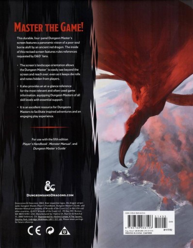 MASTER THE GAME with this indispensable tool for the world’s greatest roleplaying gameLost is the poor soul borne aloft in the grip of the ancient red dragon featured in a spectacular panoramic vision by Tyler Jacobson on this durable, four-panel Dungeon Master’s Screen. The interior rules content on this new screen has been revisited and refreshed as a direct result of feedback received from D&D fans everywhere.• The screen’s landscape orientation allows the Dungeon Master to easily see beyond the screen and reach over, even as it keeps die rolls and notes hidden from players. • Provides an at-a-glance reference for the most relevant and often used in-game information, equipping Dungeon Masters of all skill levels with essential support. • An excellent resource for new and existing Dungeons Masters to facilitate inspired adventures and an engaging play experience.The leader in providing contemporary fantasy entertainment, Dungeons & Dragons is the wellspring for the entire modern game industry, digital as well as analog. This newest edition draws from every prior edition to create a universally compelling play experience, and exemplifies the true spirit of a game that holds captive the hearts and minds of millions of players worldwide.