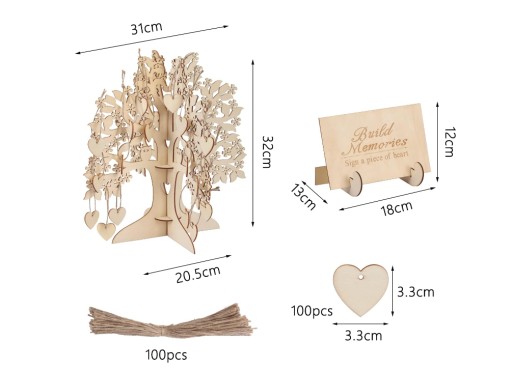 Opakowanie: 1 szt Drzewko życzeń, 100 szt Przywieszek w kształcie serca, 1 szt Tablica prowadząca i 100 szt Sznurka