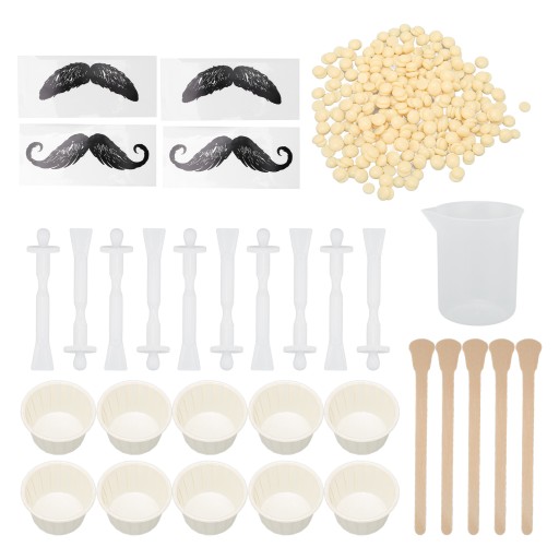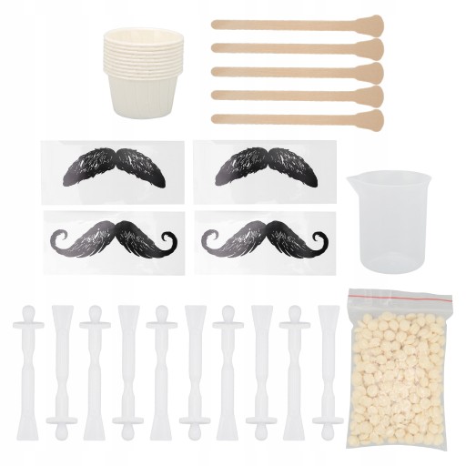 Specyfikacja: Naklejka antyprzylepna do brody, fasola woskowa 50g, kubki papierowe, patyczki do woskowania, patyczki do włosów w nosie, miarka do wagi i instrukcja obsługi