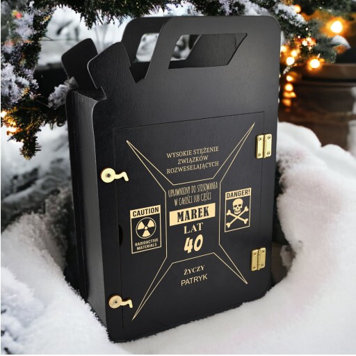 Zapewniając miejsce na ulubioną butelkę alkoholu oraz dwie szklanki lub puszki, ten barek kanister doskonale sprawdzi się jako prezent dla męża, chłopaka, taty, dziadka czy brata. Jego oryginalny wygląd przyciąga uwagę, a personalizacja według Twoich wytycznych nadaje mu jeszcze większej unikalności, czyniąc go niezapomnianym prezentem na wiele lat.