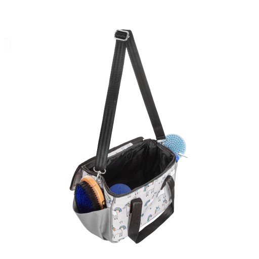 Praktyczna torba na szczotki i akcesoria do pielęgnacji konia. Zasuwana na zamek. Torba jest pojemna, oprócz komory głównej posiada także dwie boczne kieszenie. Torbę można nosić w ręku lub na ramieniu, dzięki regulowanemu paskowi.