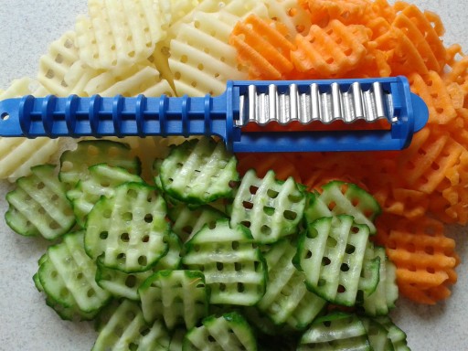 Za pomocą tego nożyka warzywa i owoce można pokroić w ozdobne talarki (kratki) , co widać na zdjęciach.