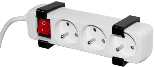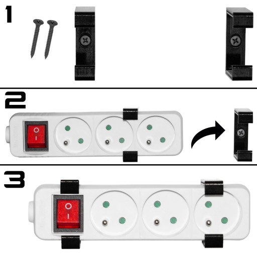 - Uchwyty można zamontować pod biurkiem lub w dowolnym miejscu gdzie używane są listwy elektryczne