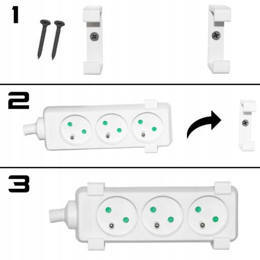 - Uchwyty można zamontować pod biurkiem lub w dowolnym miejscu gdzie używane są listwy elektryczne