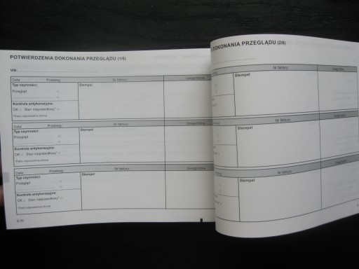 Z tyłu instrukcji znajduje się książka serwisowa do dokumentowania przeglądów okresowych w postaci 18 rubryk do przeglądów i 15 rubryk do kontroli antykorozyjnej. Wszystkie są czyste-niewypełnione !
